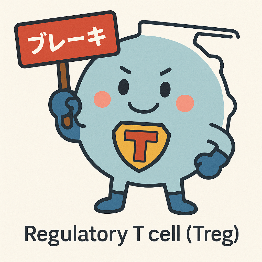 **「制御性T細胞(Regulatory T cell, Treg:ティーレグ)」**という“ブレーキ役”の細胞です。