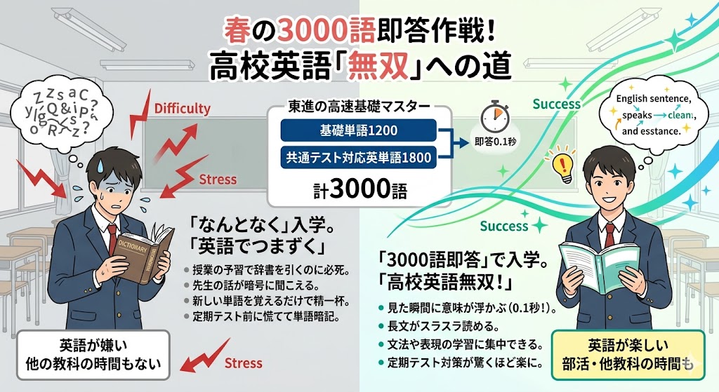入学前にこの状態を作ることができれば、高校の英語の授業は「新しい単語を覚える苦痛の時間」から、「知っている単語で長文をスラスラ読み解く楽しい時間」に変わります。